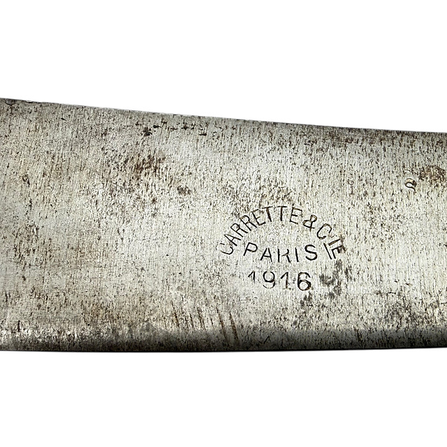 Die Machete Coupe-Coupe Modell 1916 war eine Standardbewaffnung der französischen Kolonialtruppen im Ersten Weltkrieg, insbesondere der Tirailleurs Sénégalais. Der Name „Coupe-Coupe" leitet sich vom französischen Verb „couper" (schneiden) ab. Diese Waffen wurden sowohl als Arbeitsgerät zum Freischlagen von Vegetation als auch als Nahkampfwaffe im Stellungskrieg eingesetzt. Der Hersteller Carrette et Cie in Paris war einer der Hauptlieferanten der französischen Armee für diesen Waffentyp. Das Fertigungsjahr 1916 fällt in die entscheidende Phase des Ersten Weltkriegs, in der die Tirailleurs Sénégalais unter anderem bei der Schlacht um Verdun eingesetzt wurden.
