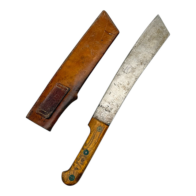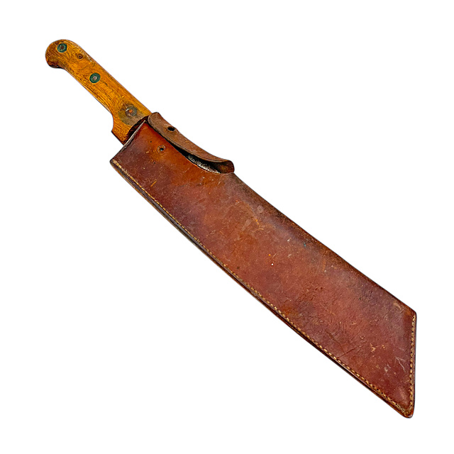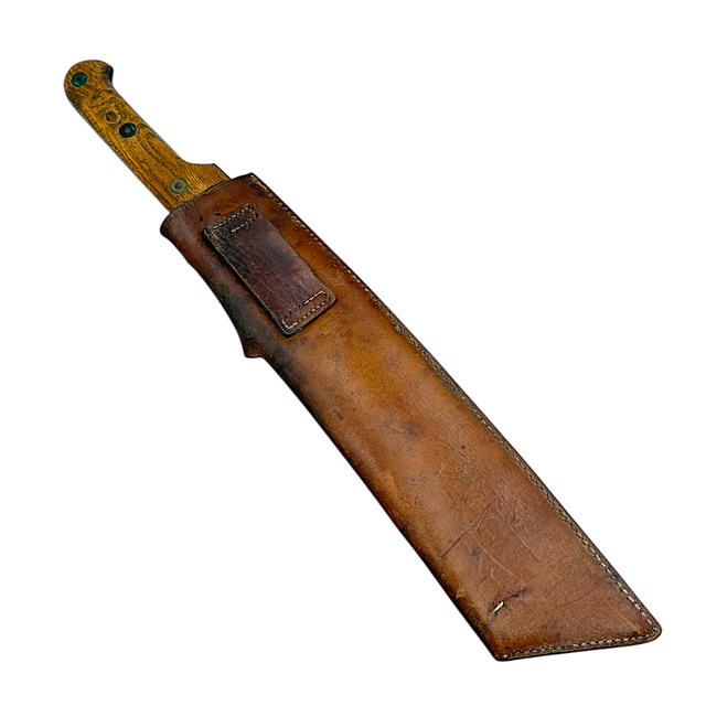 Stahl, Holz und Leder. Breite, einschneidige Klinge mit geradem Rücken und leicht abgeschrägter Spitze. Holzgriff mit drei Messingnieten befestigt. Auf der Klinge der Herstellerstempel „Carrette et Cie Paris" und die Jahreszahl 1916. Genähte Lederscheide mit Gürtelschlaufe auf der Rückseite. Die Klinge mit flächiger Korrosion und Narbigkeit, der Holzgriff mit gleichmäßiger Alterspatina und leichten Gebrauchsspuren, die Nieten mit grünlicher Oxidation. Die Lederscheide gut erhalten mit natürlicher Bräunung. Gesamtlänge 53 cm, Klingenlänge 36,5 cm.