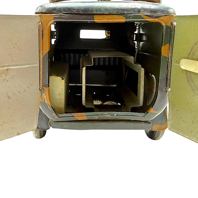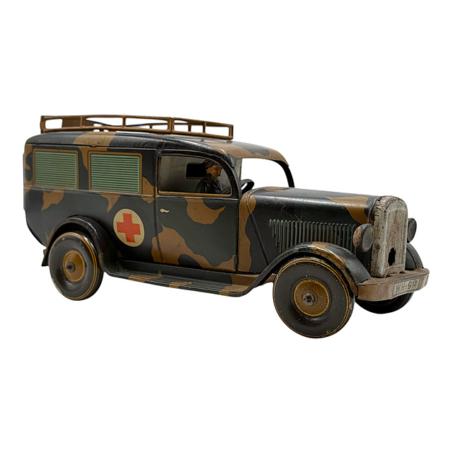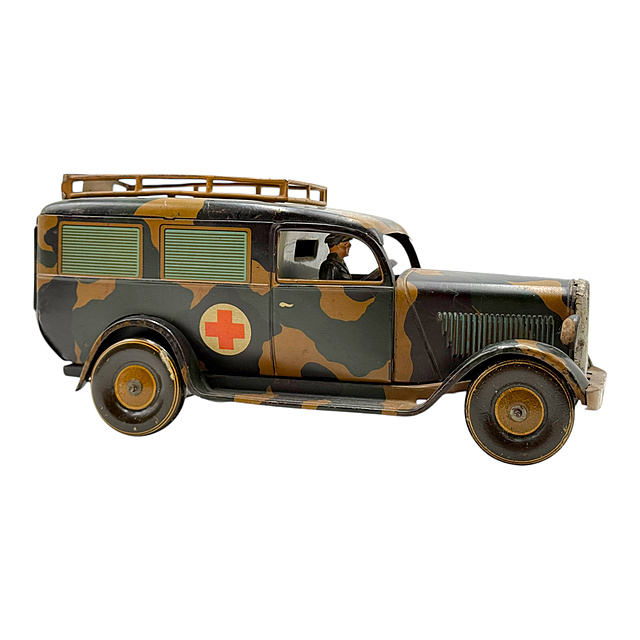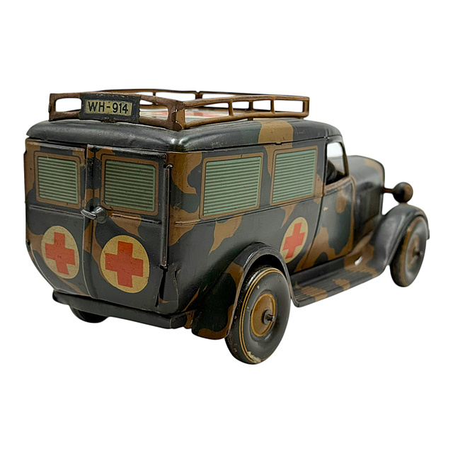 Lithographiertes Blech mit Tarnmuster. Krankenwagen der Marke Tippco (Tipp & Co., Nürnberg) in dreifarbigem Tarnmuster (Dunkelgrau, Olivgrün und Sandbraun). Geschlossener Kastenaufbau mit lithographierten Jalousien an den Seitenfenstern und Rotes-Kreuz-Markierungen beidseitig sowie am Heck. Dachgepäckträger. Blechräder. Kennzeichen „WH-914" vorne und hinten. Fahrerhaus mit Fahrerfigur. Aufklappbare Hecktür mit Blick auf die Inneneinrichtung mit seitlicher Sitzbank. Funktionsfähiger Uhrwerkantrieb mit Kardanwelle und Hinterradantrieb. Bespielt, altersgemäßer Zustand mit Gebrauchsspuren an der Lithographie. 11x22,5x8,5 cm (HxLxB).