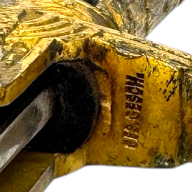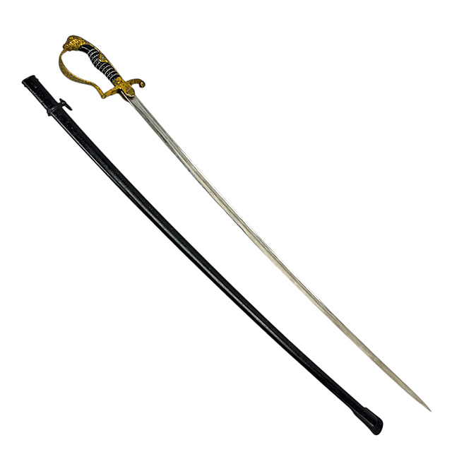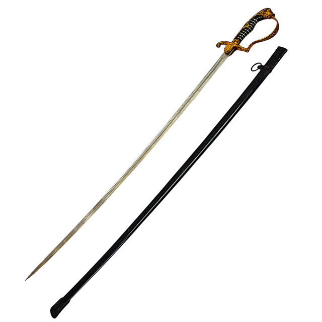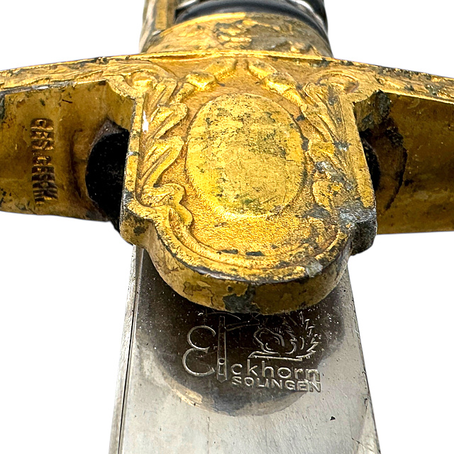 Stahl, vergoldeter Zinkguss, Drahtwicklung und Glas. Löwenkopfsäbel für Offiziere der Wehrmacht (Heer) mit feuervergoldetem Zinkgefäß. Der Löwenkopfknauf trägt rote Glasaugen. Das D-förmige Bügelgefäß ist mit reliefiertem Blattdekor verziert, das Hoheitszeichen auf der Gefäßzunge wurde entfernt. Der schwarze Griff mit silberfarbener Drahtwicklung ist größtenteils intakt. Einfach gekehlte, leicht geschwungene Klinge in gutem Zustand, am Klingenansatz bezeichnet „Eickhorn Solingen" mit Eichhörnchenmarke. Auf dem Gefäß geprägt „Ges. Gesch." (gesetzlich geschützt). Schwarzlackierte Stahlscheide mit einem Tragering. Vergoldung berieben, Lack der Scheide leicht wellig. Gesamtlänge 96,5 cm, Klingenlänge 81 cm.