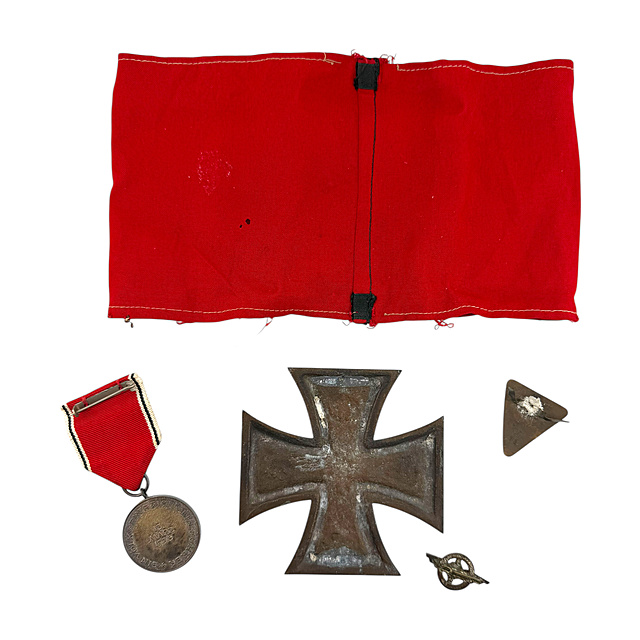 Zusammenstellung aus fünf historischen Originalen aus der Zeit des Dritten Reiches. 1) Rote Hakenkreuzarmbinde aus Baumwollstoff mit vernähtem weißen Spiegel und schwarzem Hakenkreuz aus Ripsband. 2) Versilberte „Medaille zur Erinnerung an den 13. März 1938“ (Anschluss-Medaille) am rot-schwarz-weißen Band. Die Vorderseite zeigt zwei Figuren mit Fahne, die Rückseite den Schriftzug „Ein Volk, Ein Reich, Ein Führer“. 3) Großes, massives Kreuz aus Zink in der Gestaltung des Eisernen Kreuzes und der Jahreszahl "1939". Es ist rückseitig bronziert. Wohl als Briefbeschwer genutzt oder als Auflagekreuz. 4) Dreieckiges, schwarz emailliertes Mitgliedsabzeichen der „Nat. Soz. Frauenschaft“. Rückseitig mit dem „RZM 72“. Befestigung nachverlötet. 5) Mitgliedsabzeichen des Deutschen Luftsportverbandes (DLV). Das Abzeichen zeigt einen Propeller in einem Kranz mit seitlichen Schwingen. Rückseitig markiert mit „H. Deumer Lüdenscheid Ges. Gesch.“. Guter altersgemäßer Zustand, Armbinde mit kleinen Mottenlöchern am Rand, Zinkkreuz dunkel oxidiert. Armbinde: 11x20 cm (HxB) Zinkkreuz: 8,5x8,5 cm (HxB)