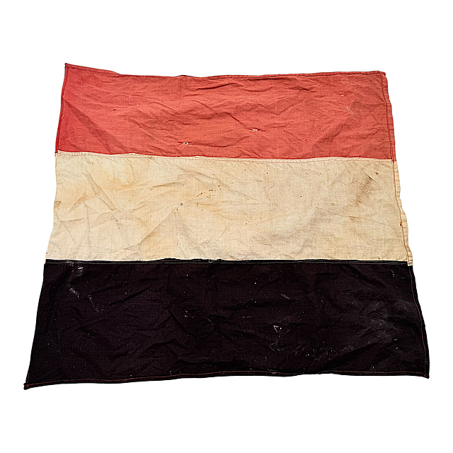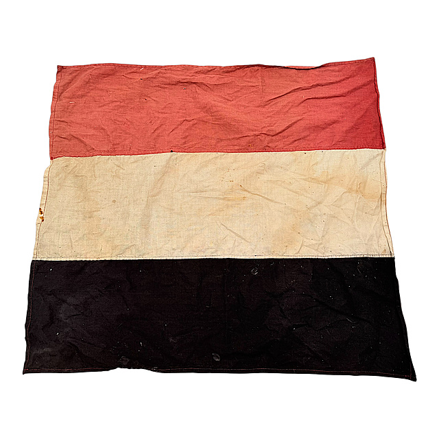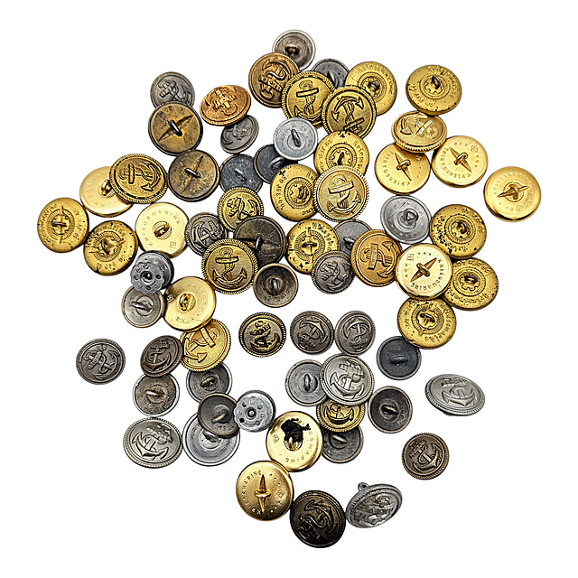 Textil, Metall, verschiedene Materialien. Umfangreiches Konvolut aus dem Nachlass eines Marineangehörigen, bestehend aus: 1) Drei Mützenbänder: „Kriegsmarine", „Grossherzogin Elisabeth" und „Artillerieschulboot Drache", zwei davon mit Goldschrift, eines mit Silberschrift. 2) Über 60 Uniformknöpfe verschiedener Hersteller in Gold- und Silberfarben, mit Ankermotiven. 3) Fünf Litzen in Silber- und Goldfarben. 4) Plattschnur für Schulterstücke. 5) Kleine genähte Fahne in Schwarz-Weiß-Rot (Kaiserreich), 46×51,5 cm, mit kleinen Mottenlöchern. Insgesamt im altersgemäß getragenen Zustand. Fahne 46×51,5 cm.