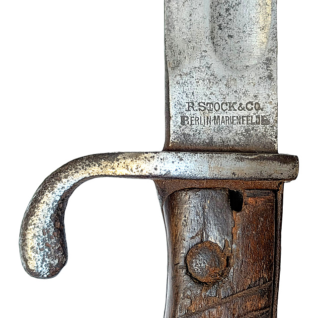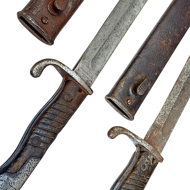 Bitte besichtigen. Das Seitengewehr 98/05 (S98/05) wurde ab 1905 als Ersatz für das S98 bei der preußischen Armee eingeführt und bis 1918 in Millionenauflage von über 40 Herstellern produziert. Es war für das Gewehr 98 konzipiert und wurde im Ersten Weltkrieg an der Westfront massenhaft eingesetzt. R. Stock & Co. in Berlin-Marienfelde war einer dieser Hersteller. Das Seitengewehr 84/98 (S84/98) war das Standardbajonett der Wehrmacht für den Karabiner 98k im Zweiten Weltkrieg. Die Pertinaxgriffe (ein Phenolharz-Schichtstoff) lösten ab etwa 1938 die älteren Holzgriffe ab. Die Kombination von Erstem und Zweitem Weltkrieg in einem Los bietet Sammlern einen Überblick über die Entwicklung deutscher Seitengewehre über vier Jahrzehnte.