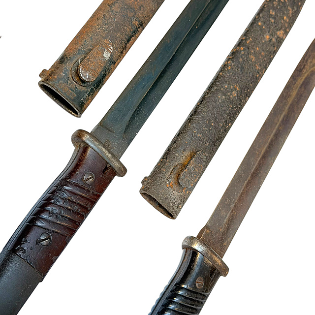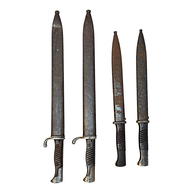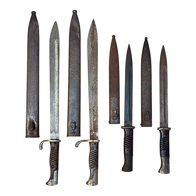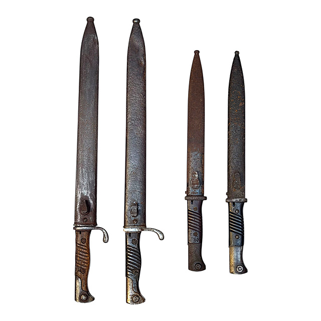 Stahl, Holz und Pertinax. Vier deutsche Bajonette des Ersten und Zweiten Weltkriegs: 1) Seitengewehr 98/05 mit Holzgriff und Stahlscheide, Klinge bezeichnet „R. Stock & Co. Berlin-Marienfelde", narbig und gereinigt, Scheide intakt. Gesamtlänge 52 cm, Klingenlänge 36,5 cm. 2) Seitengewehr 98/05 mit Holzgriff und Stahlscheide, in gleicher Erhaltung wie Nr. 1. 3) Seitengewehr 84/98 mit Pertinaxgriff und Stahlscheide, Klinge in sehr gutem Zustand. Gesamtlänge 41 cm, Klingenlänge 26 cm. 4) Seitengewehr 84/98 mit Pertinaxgriff und Stahlscheide, Klinge in sehr gutem Zustand. Die Bajonette in unterschiedlicher Erhaltung, Dachbodenfund, Scheiden intakt.