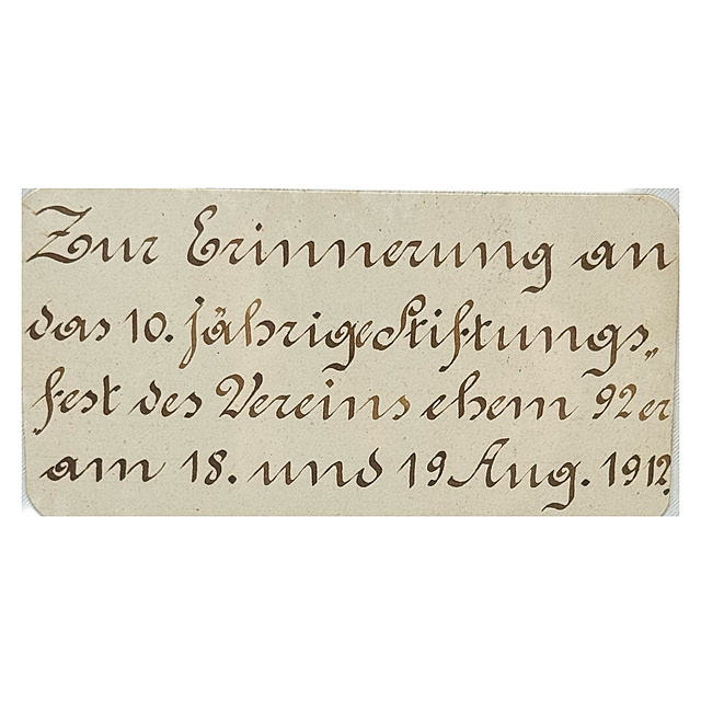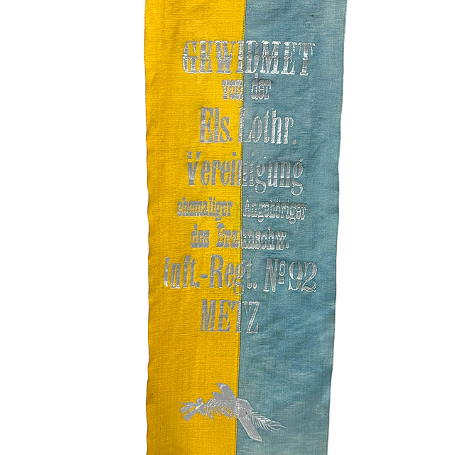 Seide, bedruckt, hinter Glas gerahmt. Ein repräsentatives Erinnerungsband der Elsass-Lothringischen Vereinigung ehemaliger Angehöriger des Infanterie-Regiments Nr. 92, Metz. Das breite Seidenband in den Farben Hellblau und Gold ist zu einer dekorativen Schleife gebunden und in einem schwarzen, profilierten Holzrahmen hinter Glas präsentiert. Beide Bandenden tragen in silberfarbener Schrift die Widmung „GEWIDMET von der Els. Lothr. Vereinigung ehemaliger Angehöriger des Braunschw. Inft.-Regt. No 92 METZ". An den Bandenden jeweils Adlermotive. Unterhalb der Schleife befindet sich ein Etikett mit der Inschrift „Zur Erinnerung an das 10. jährige Stiftungsfest des Vereins ehem 92er am 18. und 19. Aug. 1912", altersgemäß guter Zustand, Rahmen mit Gebrauchsspuren und Lackverlust, Seide gut erhalten, 91 x 57 x 5 cm (HxBxT).
