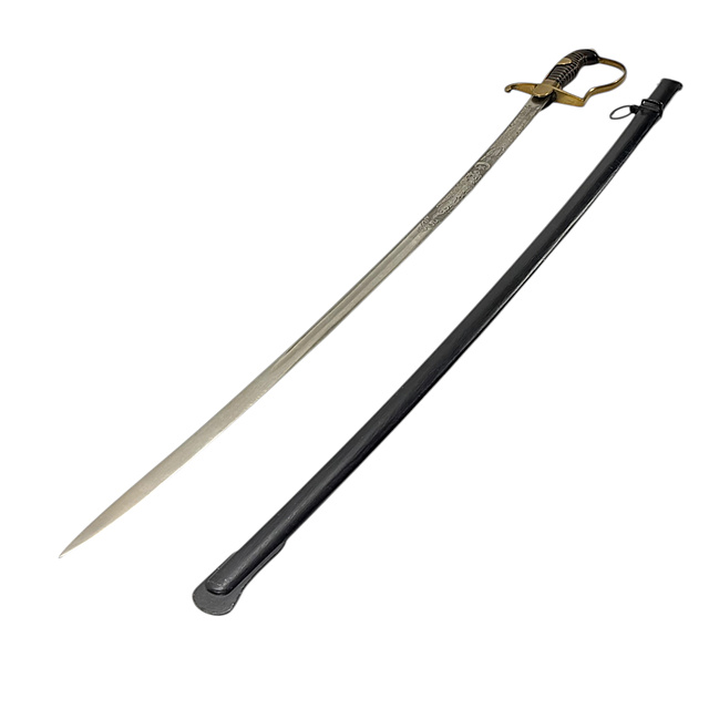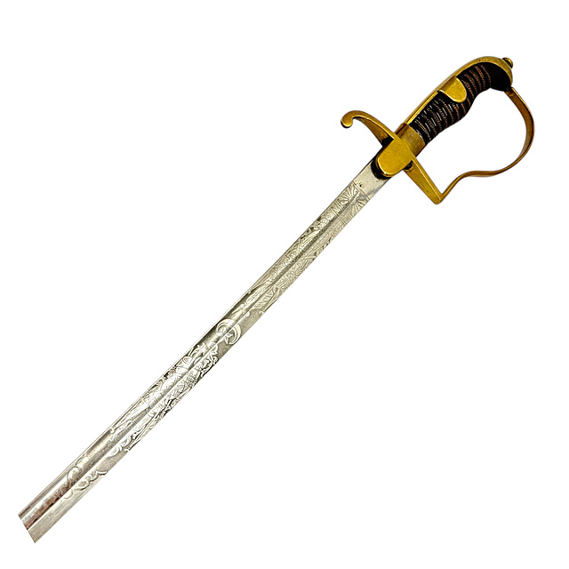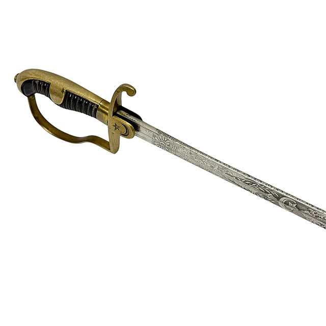 Stahl und Messing. Messinggriffstück mit D-förmigem Bügel, auf dem Parierlappen Halbmond und Stern graviert. Pertinaxgriffstück mit dreifacher Drahtwicklung. Einfach gekehlte Klinge mit aufwendigen Zierätzungen, darunter Halbmond- und Sternmotive sowie florale Ornamente. Auf dem Klingenrücken die Händlergravur „Gounalis Marcopoulos & Cie." – ein Handelsunternehmen mit Sitz in Genf und Konstantinopel. Scheide nachlackiert. Guter, getragener Zustand. Gesamtlänge 95 cm, Klingenlänge 76 cm.