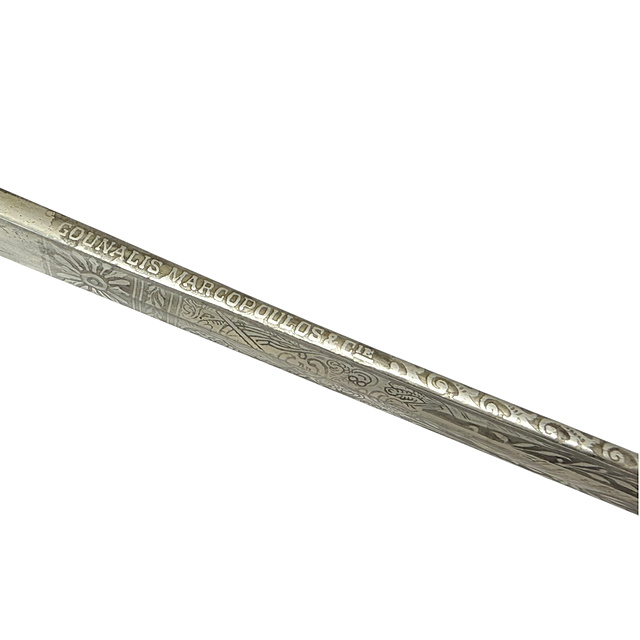 Der Säbel zeigt die charakteristischen Symbole des Osmanischen Reiches: Halbmond und Stern, die 1844 offiziell in die Flagge des Osmanischen Reiches aufgenommen wurden und als Zeichen staatlicher Autorität dienten. Die Zierätzungen mit floralen Ranken und Trophäen sind typisch für osmanische Offizierssäbel des späten 19. und frühen 20. Jahrhunderts. Die Händlergravur „Gounalis Marcopoulos & Cie." verweist auf ein griechisch-schweizerisches Handelsunternehmen, das im späten 19. und frühen 20. Jahrhundert mit Sitz in Genf und Konstantinopel tätig war. Osmanische Offizierssäbel wurden häufig von europäischen Herstellern – insbesondere aus Solingen – gefertigt und über solche Handelsunternehmen im Osmanischen Reich vertrieben. Die Klingen boten oft eine Freistelle für die Gravur des jeweiligen Händlers.