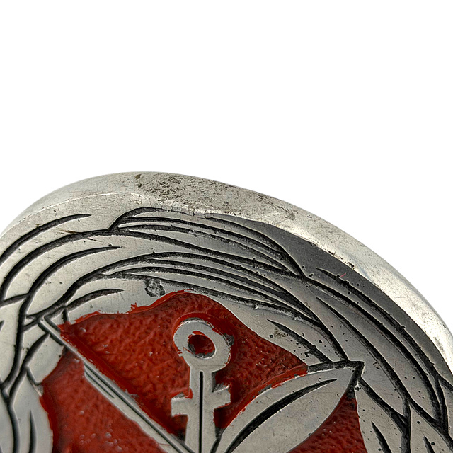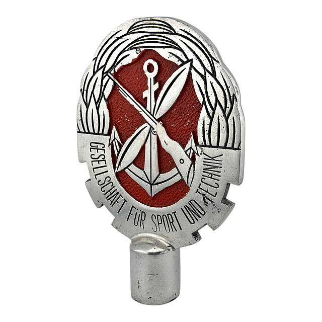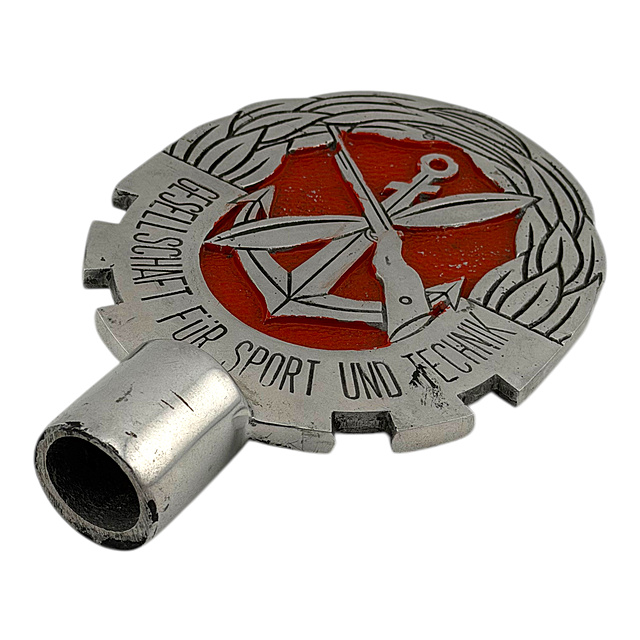 Massiver, ovaler Fahnenspitzen-Aufsatz der Gesellschaft für Sport und Technik (GST) der DDR. Altersgemäßer Originalzustand mit Patina und Gebrauchsspuren. Oben ein Sturzschaden (Stauchung des Aluminiums), 19x13 cm (H x B).
