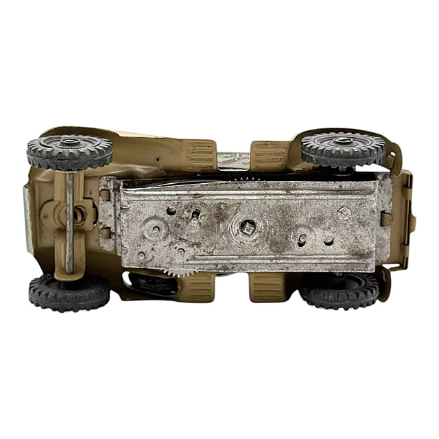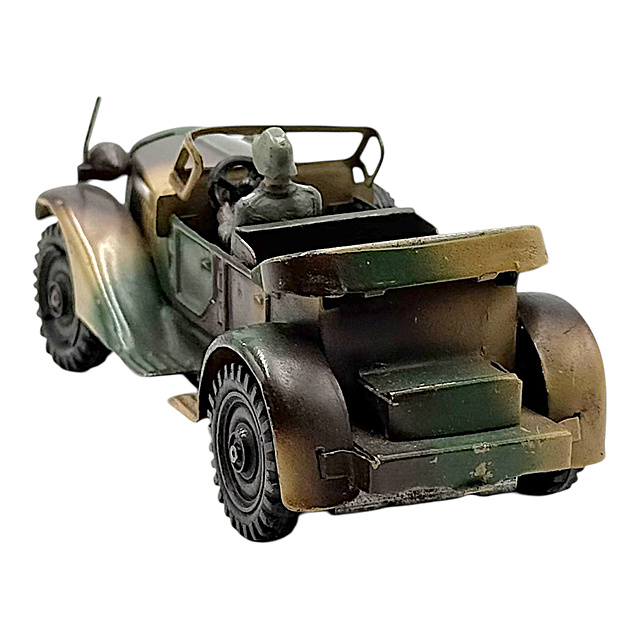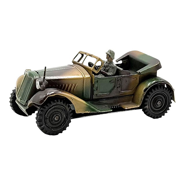 Militärische Geländewagen-Modelle in Miniaturformat gehörten zum beliebten Sortiment der deutschen Blechspielzeugindustrie. Das kompakte Format und der funktionsfähige Uhrwerksantrieb machen es zu einem typischen Spielzeug. In Frage kommende Hersteller sind Arnold (gegründet 1906 in Nürnberg), Gama (Georg Adam Mangold, gegründet 1882 in Fürth) oder Schuco (gegründet 1912, bekannt für mechanische Kleinspielzeuge).