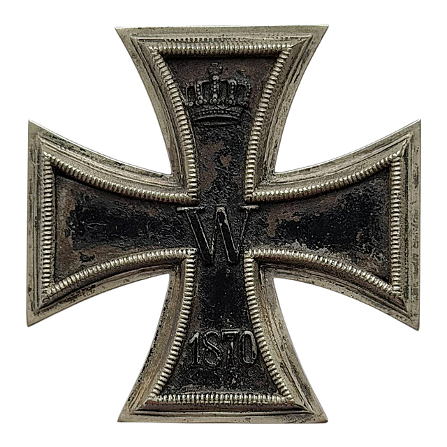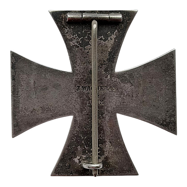 Eisen und Silber (14 Löt). Ein getragenes Eisernes Kreuz I. Klasse aus dem Deutsch-Französischen Krieg 1870/71. Die Vorderseite zeigt das bekrönte „W" für König Wilhelm I. von Preußen im oberen Kreuzarm sowie die Jahreszahl „1870" im unteren Arm, die Kreuzarme mit schwarzem Eisenkern und silbernem Rahmen in feiner Perlrandverzierung. Die Rückseite ist geputzt und trägt die Herstellerpunze „J. WAGNER & S." sowie eine Anstecknadel mit querstehendem Scharnier und Gegenhaken. Die Silberfassung in 14 Löt (entspricht 875/1000 Feingehalt), verliehenes und leicht getragenes Stück mit Gebrauchsspuren, Rückseite geputzt, 40 x 40 mm.