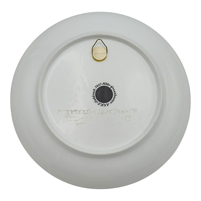 Der Porzellanteller mit Siebdruckdekor zeigt die offizielle Bezeichnung "62. INFANTERIE UND VOLKSGRENADIERDIVISION 1938-45" in schwarzer Druckschrift im Kreis um den Rand. Die Mittelfläche ist mit goldglänzendem Dekor verziert: ein stilisiertes Eisernes Kreuz in Ochre/Gold und darunter eine Mondsichel, die als das Divisionsabzeichen diente. Der Rand ist mit einer goldenen Dekorborte gesäumt. Die Rückseite trägt die Herstellerkennzeichnung "ANRA Siebdruck 5410 Höhr-Grenzhausen" in schwarzem Unterglasurdruck. Sehr guter Zustand. D. 23,5 cm.