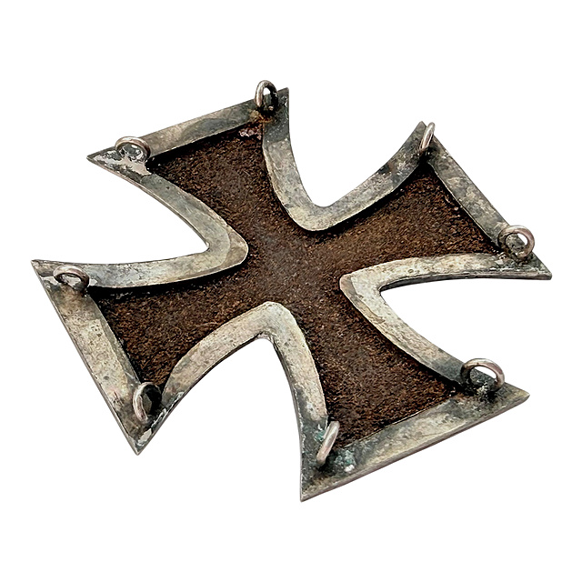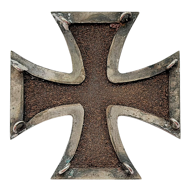 Eisen und Silber. Ein Eisernes Kreuz aus den Befreiungskriegen 1813 in der seltenen Ausführung mit acht Ösen zum Annähen an die Uniform. Der Eisenkern ist stark oxidiert und zeigt eine raue, korrodierte Oberfläche, die Silberfassung ist abgegriffen und weist deutliche Altersspuren auf. An jeder Spitze der vier Kreuzarme befinden sich jeweils zwei kleine Metallösen, die der Befestigung an der Uniform durch Annähen dienten. Altersgemäßer Zustand mit starker Patina und Oxidation, 45 x 45 mm.
